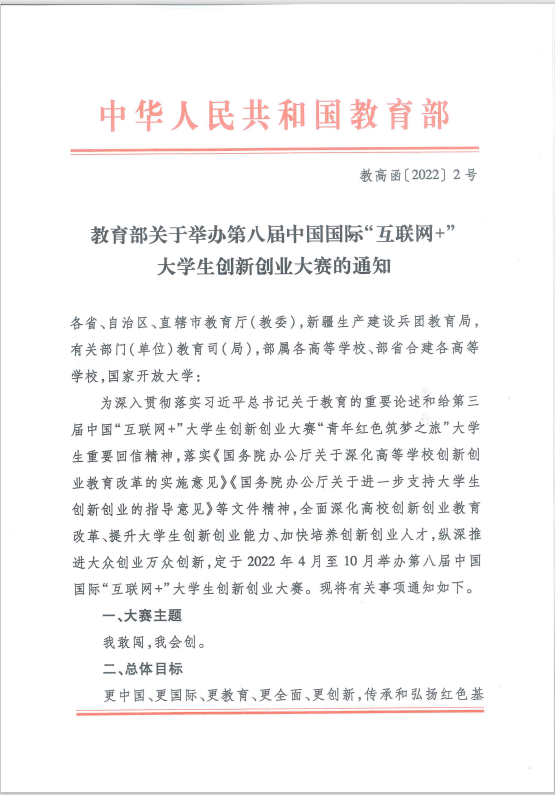 教育部关于举办第八届中国国际“互联网 ”大学生创新创业大赛的通知(盖章版)