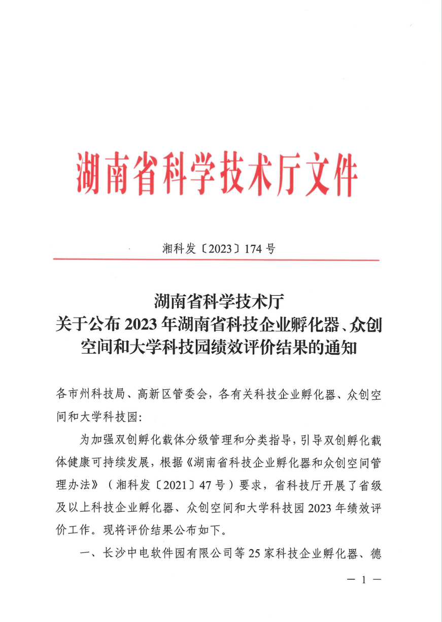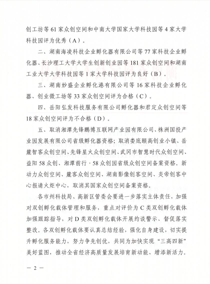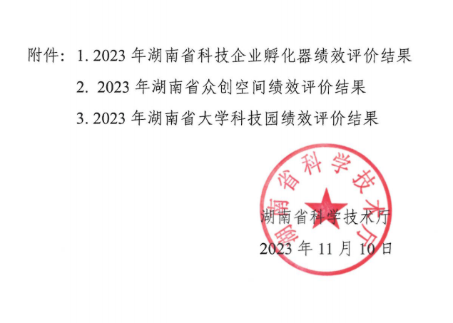 湘科发[2023] 174号 湖南省科学技术厅关于公布2023年湖南省科技企业孵化器、众创空间和大学科技园绩效评价结果的通知