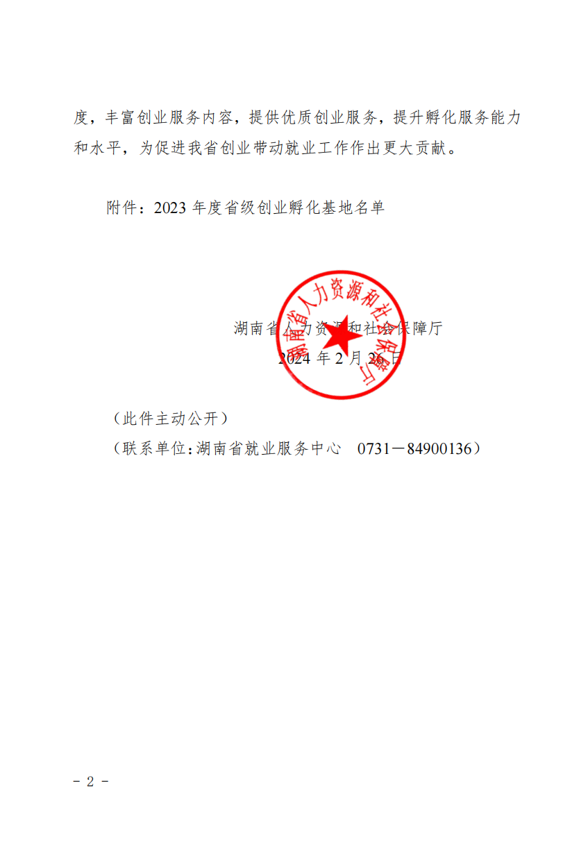 湘人社函(2024) 31号 关于公布2023年度省级创业孵化基地复评和认定结果的通知20240228