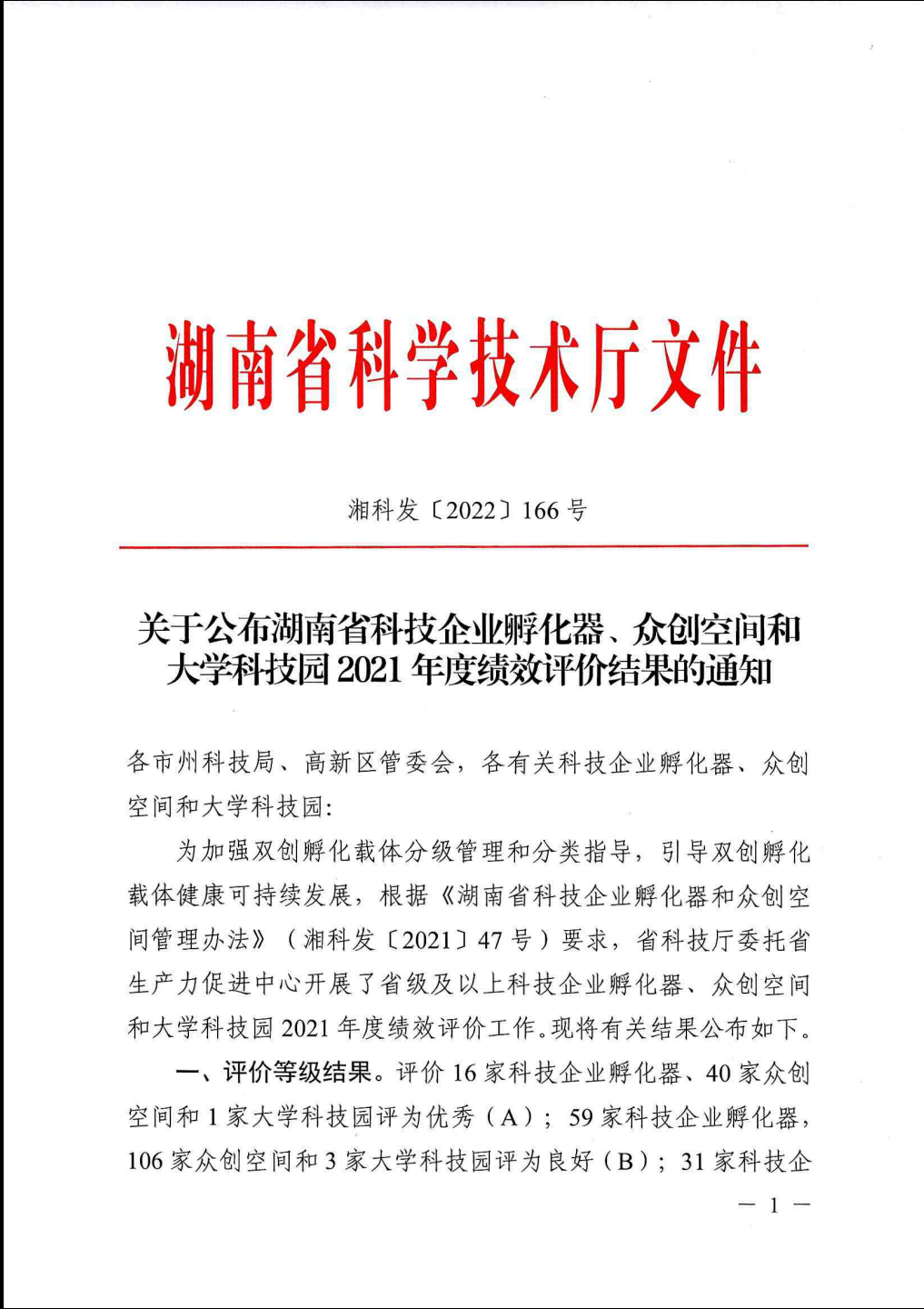 湘科发166号关于公布湖南省科技企业孵化器、众创空间和大学科技园2021年度绩效评价结果的通知(1031).pdf