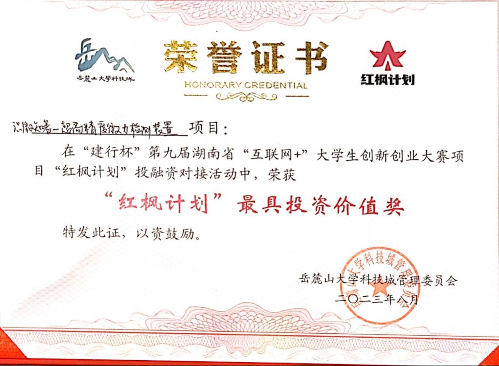 更值得欣喜的是,该项目同样在接下来针对省赛一等奖项目和往届优秀国赛铜奖项目的“红枫计划”投融资对接活动中以其广阔的商业前景荣获主办方授予的“最具投资价值奖”(奖金1万元),并顺利同湖南麓山科技投资有限公司当场签署了投资意向合同。