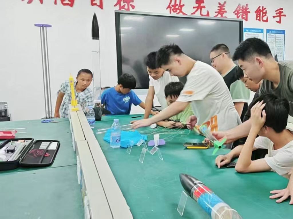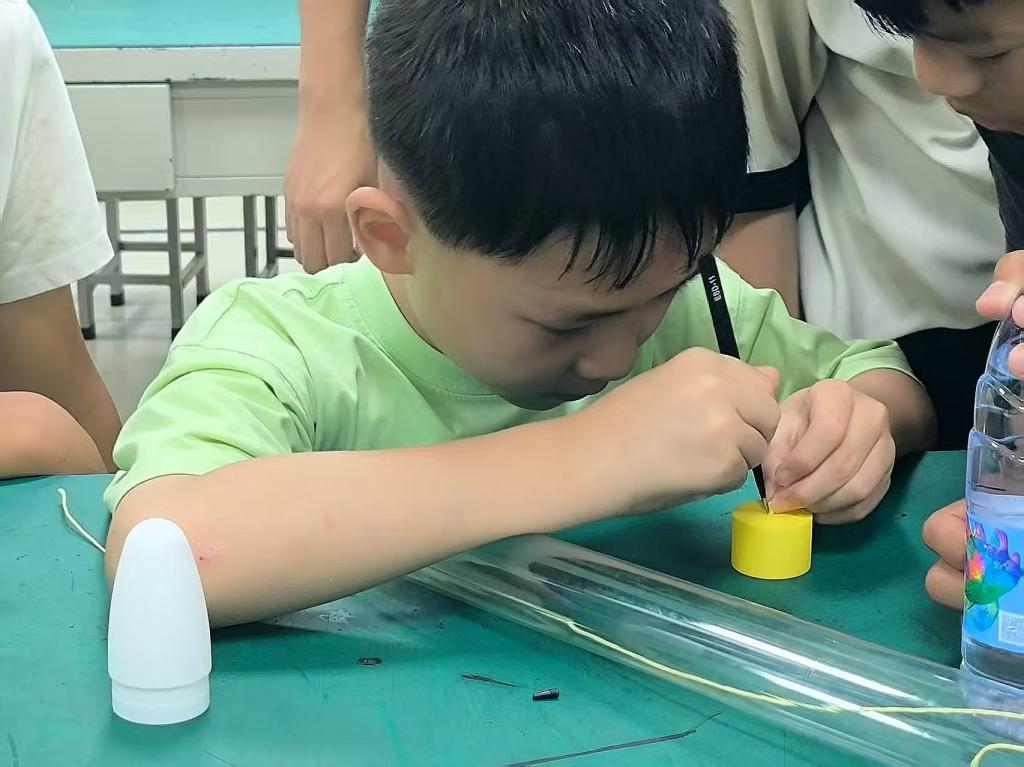 纸上得来终觉浅,绝知此事要躬行。随后,团队成员引领孩子们踏入了动手实践的奇妙世界。面对琳琅满目的模型零件,从精巧的箭体、稳定的尾翼到关键的固体燃料发动机部件,孩子们在大学生“导师”们的悉心指导下,全神贯注地投入到火箭的“诞生”过程。他们小心翼翼地粘贴部件,反复校准尾翼角度,每一次黏合都屏息凝神,每一次调试都精益求精。当亲手将零散部件赋予“火箭”的生命形态时,那份油然而生的自豪感瞬间点亮了他们兴奋的小脸。