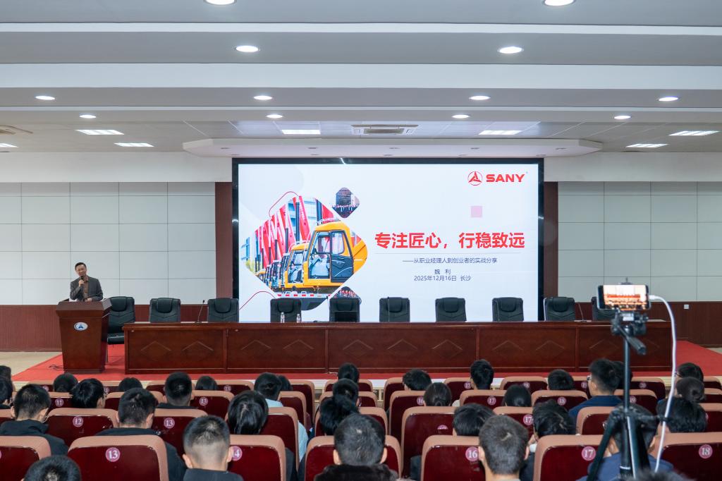 魏利校友以《专注匠心,行稳致远——从职业经理人到创业者的实战分享》为主题,回顾了自己从长沙航院毕业后进入三一重工,从泵车调试工起步,逐步晋升为工段长、制造部长,直至子公司总经理的职业生涯。他重点分享了2005年主导“胶管质量改善项目”获省级国家级奖项、推动“服务万里行”成为行业标杆案例等关键经历,强调了在基层积累、跨岗位锻炼与全局视野拓展的重要性。2014年,他带领核心团队创业,聚焦湖南、贵州、云南区域市场,坚持长期主义与精耕细作,十年间将企业打造为区域龙头,年经营规模突破25亿元。