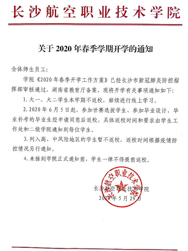 学院《2020年春季开学工作方案》已经长沙市新冠肺炎防控指挥部审核通过、湖南省教育厅备案,现将开学有关事项通知如下:
