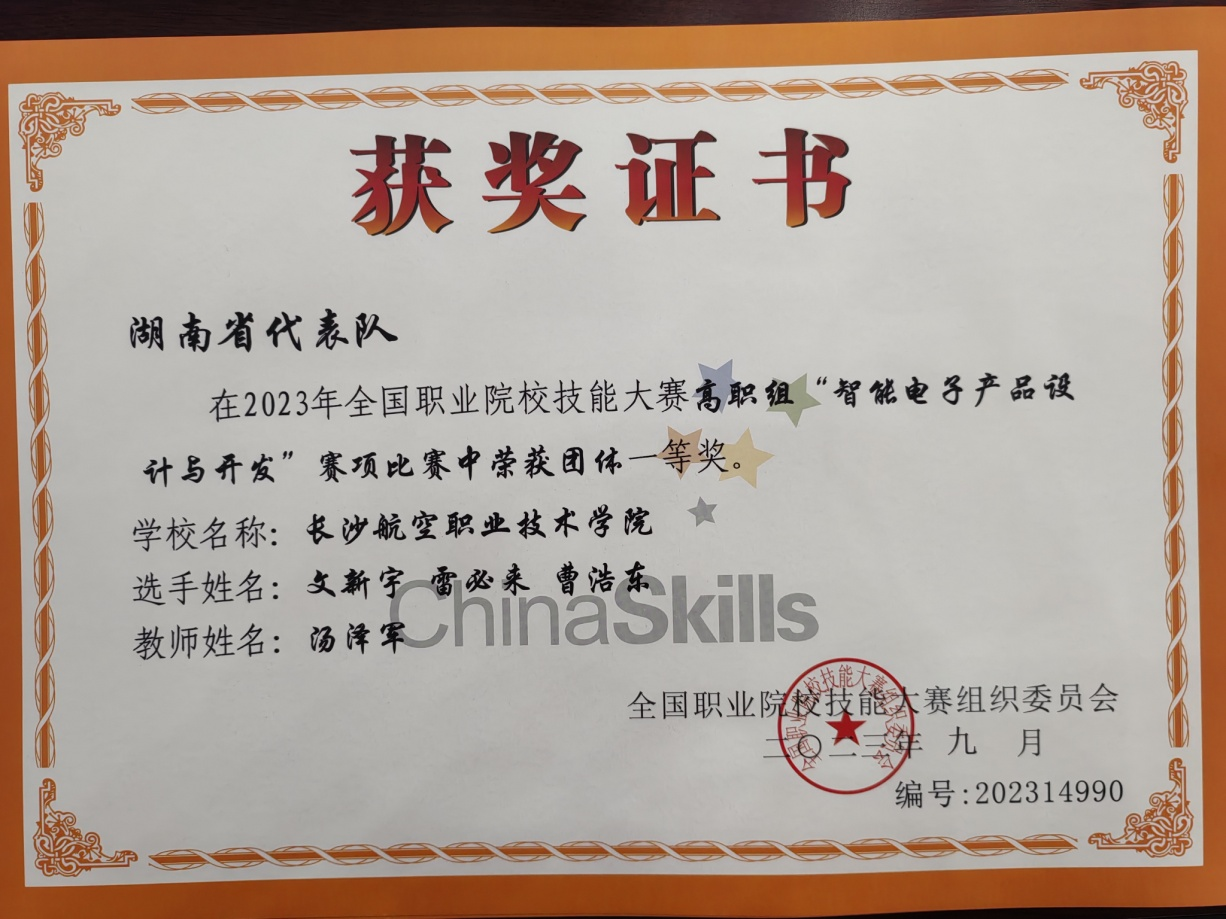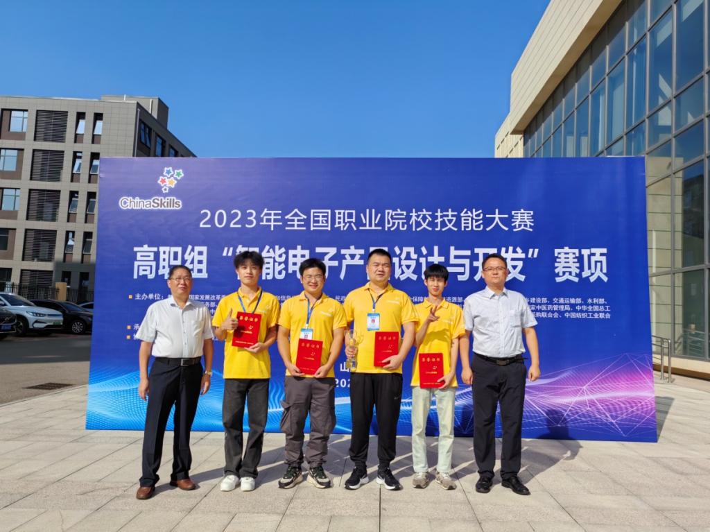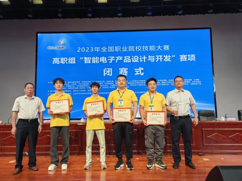 2023年,全国职业院校技能大赛进行了赛项调整改革,“智能电子产品设计与开发”赛项为师生同赛赛制,每个参赛队由1名老师和3名学生组成,每年举行一次。该赛项既考察参赛选手电子技术、电工技术、微处理器技术、检测技术、控制技术、人工智能技术等方面的专业知识,又检验参赛选手电路设计、PCB制作、电子电路安装与调试以及智能产品设计、装调、检测、维修、集成等方面的职业能力。通过竞赛检验和展示高职院校师资队伍建设、教育教学改革、专业升级改造的成果,促进校企紧密合作、产教深度融合,改革人才培养模式,提升人才培养质量,服务产业结构调整和高质量发展。自3月份省赛结束以来,由王文海、周欢喜等老师组成的指导教师团队,克服了由于赛项改革带来的竞赛内容、设备、要求等不明确的各种不利因素,组织选手开展有计划的训练。汤泽军老师和文新宇、雷必来、曹浩东3名同学,在激烈的角逐和紧张的比赛氛围中,沉稳思考,冷静操作,表现出良好的专业技能和心理素质,最终获得该赛项一等奖。