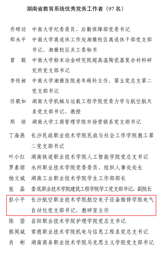 7月31日,从省委教育工委《关于表彰全省教育系统优秀共产党员、优秀党务工作者和先进基层党组织的通报》(湘教工委通〔2024〕25号)获悉,我院航空电子设备维修学院电气自动化党支部书记、教研室主任彭小平荣获“湖南省教育系统优秀党务工作者”。
