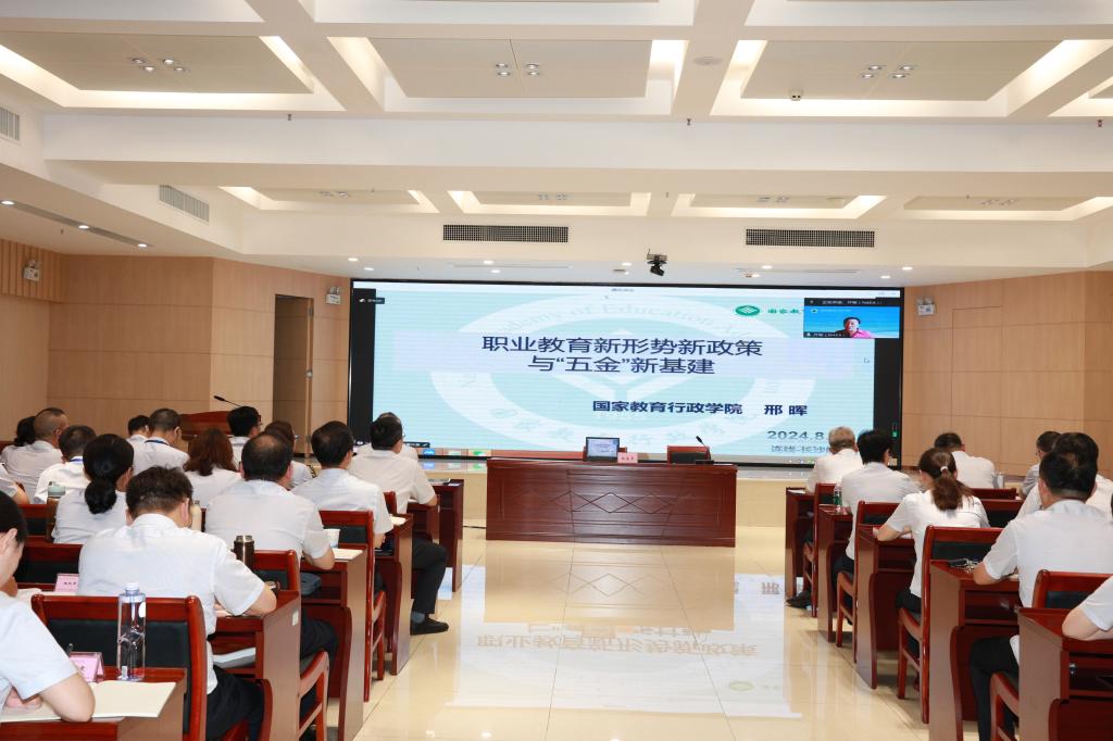 8月30-31日,我院2024年中层以上干部暑假集训在跳马校区协同创新中心一楼会议厅举行,期间,我院特邀国家教育行政学院研究员、教授邢晖作《职业教育新形势新政策与“五金新基建”》线上专题讲座,讲座由我院党委书记朱国军主持,中层以上干部70余人参加。
