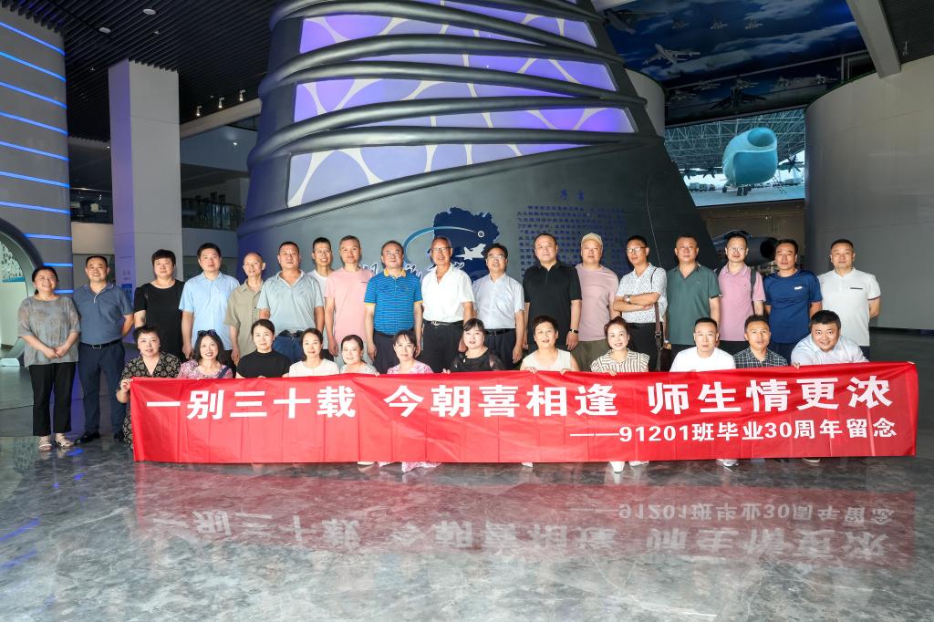 随后,校友一行参观了学院校容校貌、实习实训场所和学习生活设施。站在昔日教学楼前,大家驻足凝望,激情燃烧的青春岁月仿佛就在昨天。在当年的教室里,91201班会再次召开。全体人员首先共同观看了班委会们精心制作的怀旧视频。一张张老照片瞬间带着大家穿越时空,回到了30年前那段青春岁月,熟悉又亲切的感觉扑面而来,令人激动不已。已经83岁的辅导员沈祖炎依然精神矍铄,在点名结束后,他对同学们30年后重聚在母校表示无比激动,回顾与同学们朝夕相处的校园生活感慨万千,对大家在各自工作领域取得的成就表示祝贺,更鼓励大家要不忘初心,牢记使命责任,再接再厉,努力为国家的航空事业和个人的幸福生活而奋斗。在个人发言环节,校友们争相上台回忆自己在校期间的学习生活经历,汇报了这30年来在祖国各地不同岗位上的奋斗历程和人生体悟,表达了对母校精心培育的感激之情,衷心祝愿母校事业发展蒸蒸日上、再创辉煌。现场气氛热烈,掌声、笑声频频。