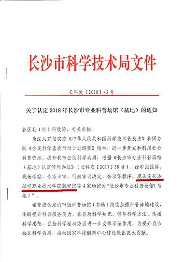 根据《长沙市专业科普场馆(基地)认定管理办法》(长科发〔2017〕38号),我院航空馆经申报推荐、现场考察、专家评审、行政审议决定、公示等程序,10月16日,我院航空馆被长沙市科学技术局授予“长沙市专业科普场馆(基地)”称号。