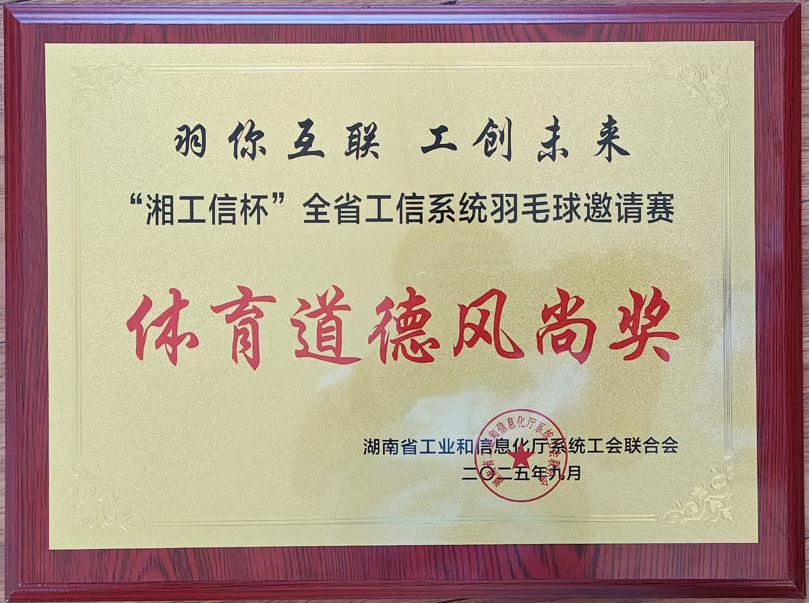 9月12日至13日,湖南省工业和信息化厅系统工会联合会在长沙成功举办“湘工信杯”湖南省工信系统羽毛球赛,主题为“羽你互联、工创未来”。我院由杨晓波等教师组成的代表队在比赛中团结拼搏、展现风采,最终荣获“体育道德风尚奖”。