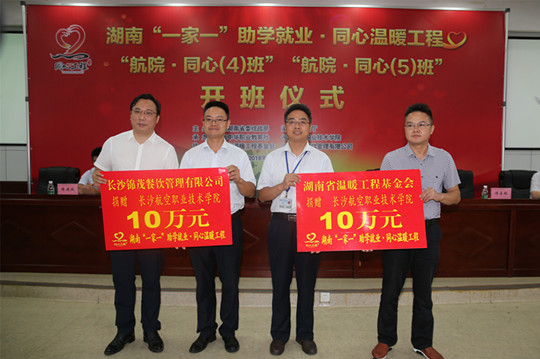此次活动由中共湖南省委统战部、湖南省教育厅主办,湖南中华职业教育社、我院承办。此次签约的2个“航院·同心班” 共获助40万元,湖南省温暖工程基金会和长沙市锦茂餐饮管理有限公司各出资10万元捐款支持,我院自筹资金20万,继续给予从该院武陵山片区等地区中选出的100名家庭贫困的新生,每人资助生活费4000元,至此我院共有250名武陵山片区的学生受到这项资助。