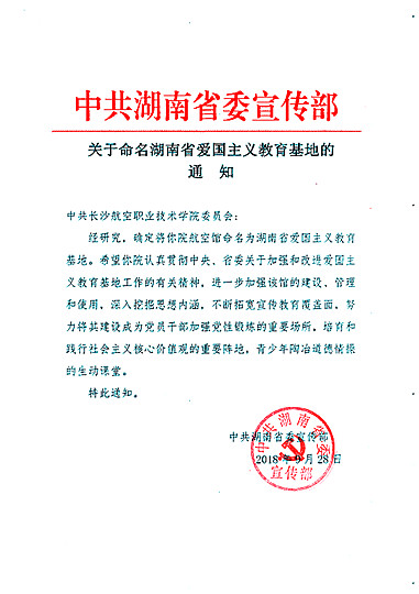 9月28日,我院航空馆被湖南省委宣传部确定为“湖南省爱国主义教育基地”。