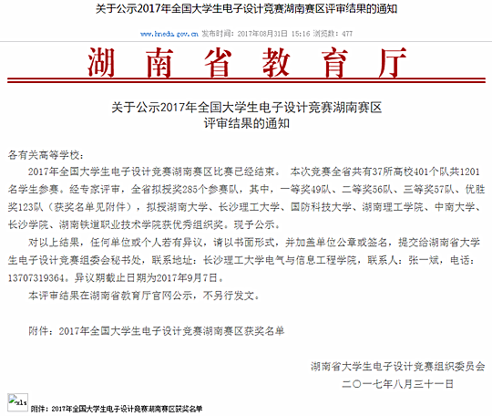 湖南省教育厅官网公示2017年全国大学生电子设计大赛湖南赛区评审结果