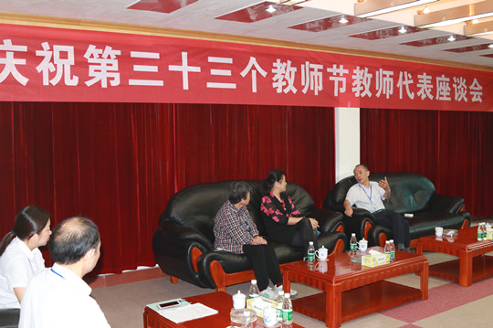 9月6日,在第33个教师节即将到来之际,在政治部、工会、人事处的共同组织下,我院分别举行了庆祝教师节离退休教师代表座谈会、在职教师代表座谈会,院长朱厚望、党委书记陈勇、副院长关云飞等领导与教师代表座谈,共商学院发展大计,共话学院美好前景。政治部主任严灿、人事处处长刘永明、工会常务副主席张建中出席座谈会。