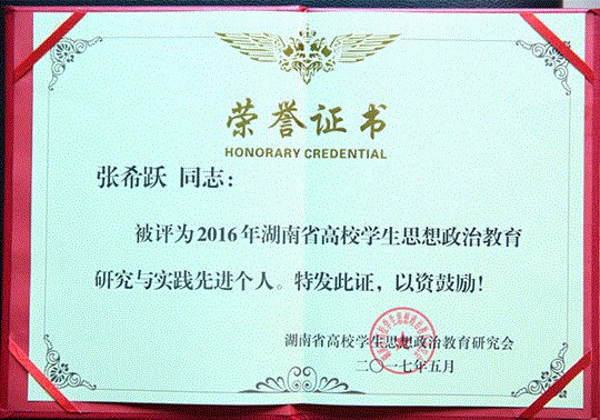 会上,省委教育工委宣传部部长曾力勤宣布了研究会年度表彰决定,我院荣获2016年湖南省高校辅导员工作研究与实践先进单位称号,党委学生工作部张希跃部长被评为2016年湖南省高校学生思想政治教育研究与实践先进个人,机电学院辅导员李萍老师被评为2016年湖南省高校辅导员工作研究与实践先进个人。