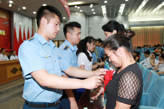 毕业生为家长佩戴红花,表达感谢之情