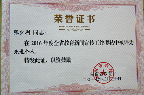 张少利被评为2016年全省教育新闻宣传工作先进个人