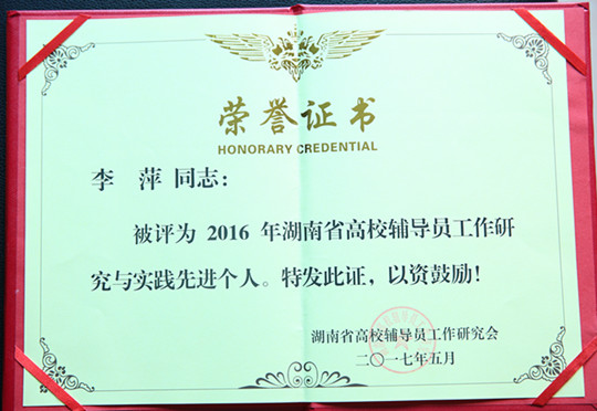 会上,省委教育工委宣传部部长曾力勤宣布了研究会年度表彰决定,我院荣获2016年湖南省高校辅导员工作研究与实践先进单位称号,党委学生工作部张希跃部长被评为2016年湖南省高校学生思想政治教育研究与实践先进个人,机电学院辅导员李萍老师被评为2016年湖南省高校辅导员工作研究与实践先进个人。