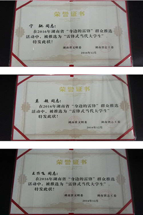 日前,由湖南省文明委、志工委主办的“喜迎十九大志愿我先行”---湖南省第54个学雷锋日暨第5个湖南志愿者日纪念活动在长沙碧桂园凤凰酒店隆重举行。省委常委、省委宣传部部长蔡振红、副省长向力力等领导出席此次活动。活动揭晓了2016年湖南省学雷锋志愿服务先进典型推选活动获奖名单,其中我院青年志愿者协会荣获2016年“湖南省学雷锋志愿服务百强社团”荣誉称号,机电学院宁驰、管理学院莫超、机制学院王贇飞获评“雷锋式当代大学生”。