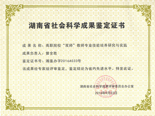 日前,我院两项科研成果通过湖南省社会科学成果鉴定。此次成果鉴定湖南省共有96项成果通过鉴定,其中7项成果鉴定为“省内领先”,47项为“省内先进”。朱厚望院长的著作“基于6S的职业教育实践教学星级评价研究与实践”鉴定等级为“省内领先”。本次成果鉴定中,我院是唯一获得“省内领先”等级的高职院校。曾全胜副院长的著作“高职院校‘双师’教师专业技能培养研究与实践”鉴定等级为“省内先进”。