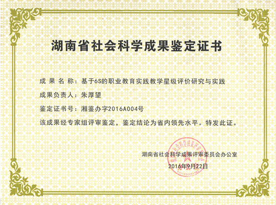 朱厚望院长湖南省社会科学成果鉴定“省内领先”证书