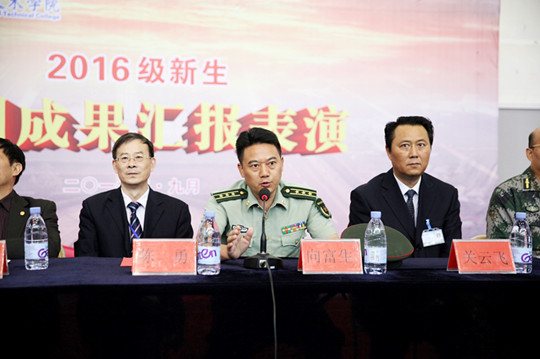 向富生主任用“紧贴大纲,内容丰富动感”,高度评价了我院2016级新生军训汇操。向主任指出,同学们经过半个多月的训练,充分学习了军事技能、真切体验了军旅生活、感受了军营文化,上了一堂有品质、有温度的大学第一课。他对巩固深化军训成果、开好大学军事课提出三点希望:一是希望学校一如既往用心开展军事课;二是希望更多的青年学子真心爱上军事课;三是希望学校老师改革创新军事课建设。向主任表示,我院根脉在军工、服务于军队,有着深厚的军队情结和闪亮的军字招牌,希望广大学子牢记校训、秉持精益求精的工匠精神、坚持技术报国、为军服务的人生导向,把为军育才的军字招牌擦得更亮,把引领时代的战鹰放的更高。
