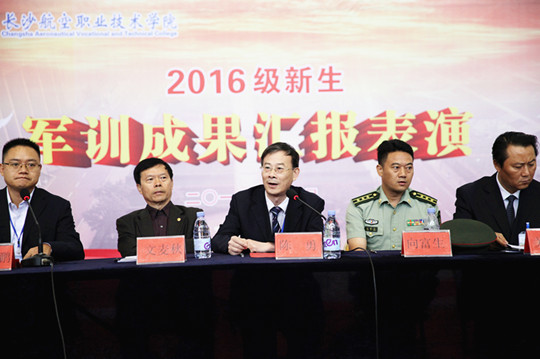 9月29日,我院三千新生军训成果汇报表演在圭塘校区举行。省军训办公室向富生主任,省教育厅体育卫生与艺术教育处副处长文麦秋,湖南理工大学等多所学校武装部领导出席。我院党委书记陈勇出席并对此次军训中创新军训形式、突显航院理念文化熏陶等做法给予了充分肯定。我院副院长关云飞、党委副书记蔡海鹏、党委委员等领导出席。蔡副书记主持军训典礼。