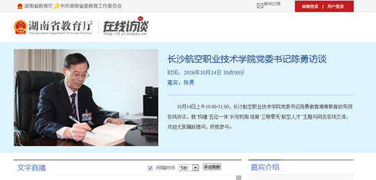 10月14日上午10:00-11:00,澳门十大靠谱的网站党委书记陈勇做客湖南教育政务网在线访谈,就“构建“五位一体”长效机制 培育‘三敬零无’航空人才”主题与网友在线交流,欢迎大家踊跃提问,积极参与!