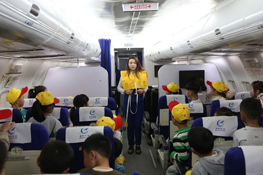 志愿者演示民航飞机逃生知识