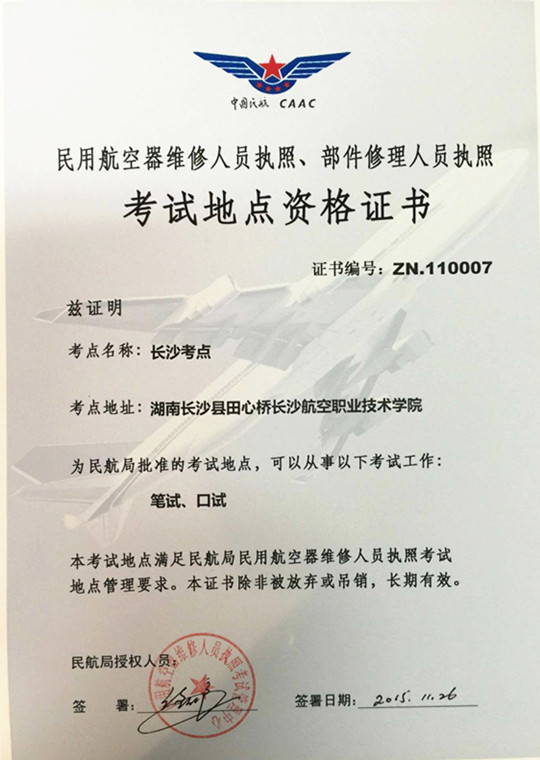 11月26日,民航局民用航空器维修人员执照考试管理中心主任任仁良向我院签发了民用航空器维修人员执照、部件修理人员执照考试地点资格证书(证书编号:ZN.110007),考点名称为“长沙考点”。这标志着我院成功通过民航局民用航空器维修人员执照考试管理中心对长沙考点的各项审查,获得开展CCAR-66部基础执照笔试和口试考点资格。