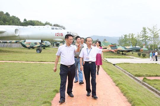 朱院长(右)陪同张院长(左)一行参观飞机停机坪