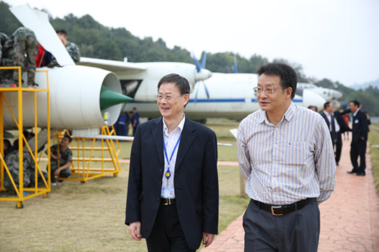 参观飞机展示坪(右为张俊平院长,左为陈勇书记)