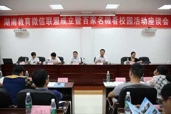 下午,湖南教育微信联盟成立暨“百家名微看校园”活动座谈会在我院培训中心举行。省教育厅信息中心主任唐东斌、书记杨晓北、省委网宣办网络协调处处长刘厚、我院党委副书记蔡海鹏、党委委员、政治部主任严灿出席了会议。会议上,各位领导和联盟成员们共同探讨了以微信为代表的新媒体的构建与运营等问题,以及在“互联网+教育”这一新领域取得的积极成果。其中,长沙市教育局、湖南理工学院、湖南工艺美院三个联盟成员做了微信运营经验的分享。
