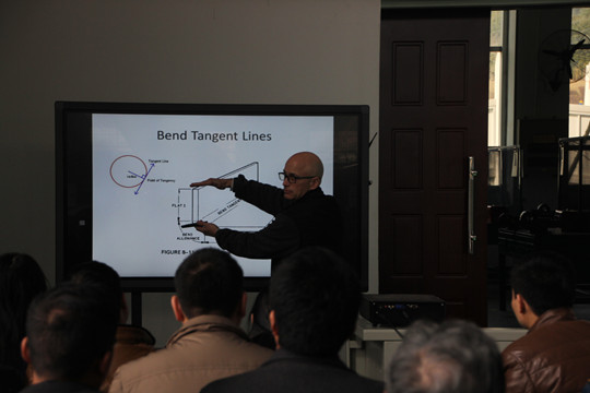布雷德教授为本次公开课做了精心的准备,他通过风趣、幽默的授课,向大家讲解了板料弯折成形过程中计算下料长度的方法和过程。课堂上,布雷德教授和学生之间进行了良好的交流与互动,学生积极踊跃提问,布雷德教授耐心的回答,整个教学过程生动、活泼。授课结束后,还有几名学生针对专业问题继续向布雷德教授请教。(文\协同创新中心培训与国际交流处 陈蓉 图\大学生记者团 李文豹 曾雪娟)