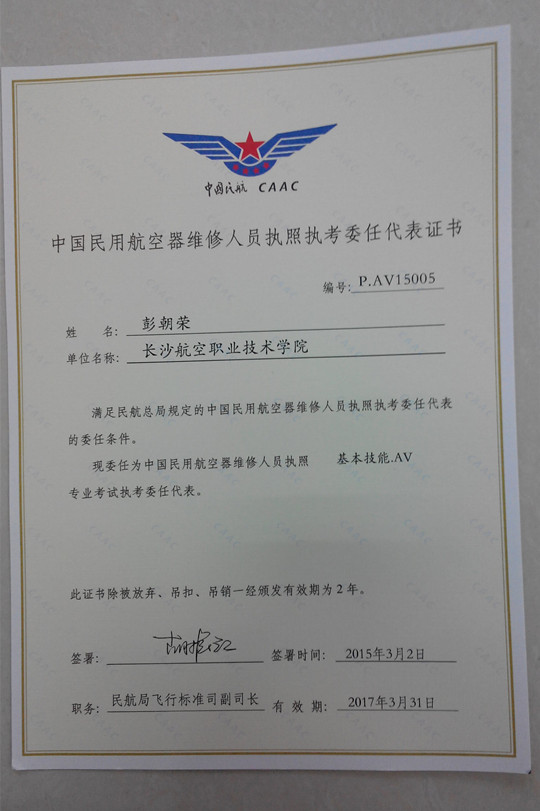 3月2日,我院彭朝荣等三位教员(含外聘两位)获得民航局CCAR-66部(民用航空器维修人员执照)委任考官资质,这是我院教员首获此类委任,意义重大。