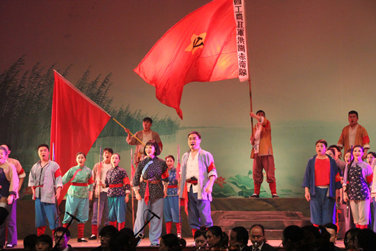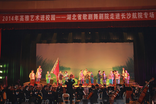 11月22日,由教育部、文化部和财政部共同举办的“2014高雅艺术进校园——湖北省歌剧舞剧院走进长沙航院专场”活动在跳马校区体育馆举行,省教育厅文体卫艺处副处长文麦秋、院长朱厚望、退休老干部、学院领导及师生共2000余人观看演出。湖北省歌剧舞剧院用动人的旋律、精湛的表演,传神地演绎了经典剧作《洪湖赤卫队》,赢得了观众的阵阵喝彩。