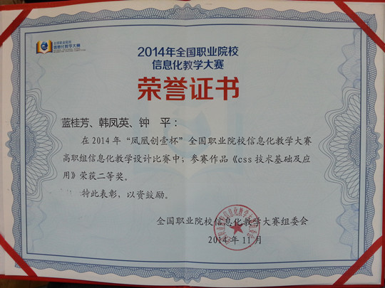 11月3日,2014年“凤凰创壹杯”全国职业院校信息化教学大赛决赛在南京落下帷幕,我院教师蓝桂芳、韩凤英、钟平选送的参赛作品《css技术基础及应用》喜获高职组信息化教学设计二等奖。