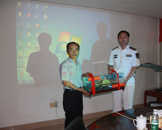 蚌埠士官学校毛国杰校长向朱厚望院长赠送“辽宁舰航母模型”以见证双方友谊。