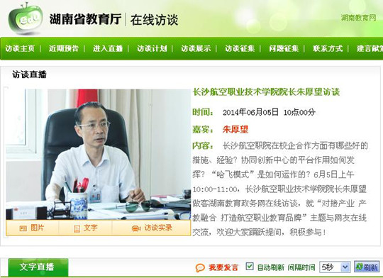 6月5日上午10:00-11:00,我院院长朱厚望将做客湖南教育政务网在线访谈,就“对接产业 产教融合 打造航空职业教育品牌”主题与网友在线交流,分享学院在推动“校企合作、产教融合”方面比较成功的做法和经验,介绍学院在探索现代高职教育校企合作新路径、构建产教合作长效机制、打造航空职业教育升级版方面的心得体会。