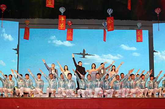 晚会在热情洋溢的开场舞中拉开了帷幕,由大学生艺术团带来的《最好舞台》点燃全场,观众被舞者的热情所感染,青春的热浪席卷全场。本次晚会分为军旅情、航修志、报国梦三个篇章,融合了歌曲、朗诵、快板、戏曲、舞蹈等多种形式的节目,精彩纷呈,高潮迭起,给大家提供了一场视听盛宴。晚会还通过长航易班平台进行现场直播,线上线下进行互动答题,送出多份精美礼品。晚会上,舞蹈《我也想当兵》《共圆中国梦》、歌舞改编《航修追梦人》《赞赞新时代》、戏曲联唱《中华一家亲》、朗诵《航院,骄傲起航的地方》等,从不同角度展现了我院师生的才艺与精神风貌。士官学院的女士官们,展现出巾帼不让须眉的非凡气质,一首原创快板《航修教师礼赞》夸赞了全校各个岗位的老师和辅导员们,他们心系学生、爱岗敬业,演绎出精彩的职教人生。由各二级学院带来的师生歌曲大联唱点燃全场观众的爱国热忱,将晚会推向高潮。晚会最后在歌舞《我们的新时代》中落下帷幕。