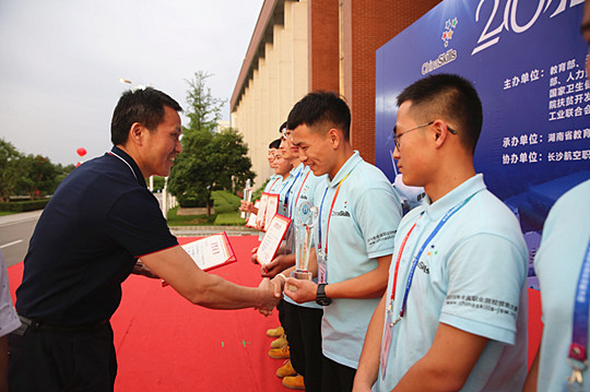 赛区执委会委员、湖南省教育厅职成处处长余伟良为大赛一等奖选手颁奖