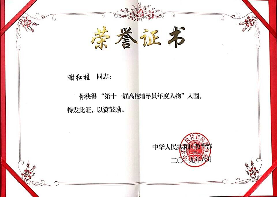 近日,由教育部主办的“第十一届全国高校辅导员年度人物”评选结果揭晓,我院管理学院党总支书记谢红桂荣获“全国第十一届高校辅导员年度人物入围奖”,为我院辅导员队伍专业化建设树立了标杆,是我院在该项评选中历史性的突破。