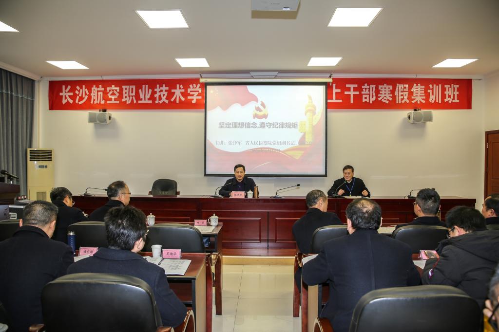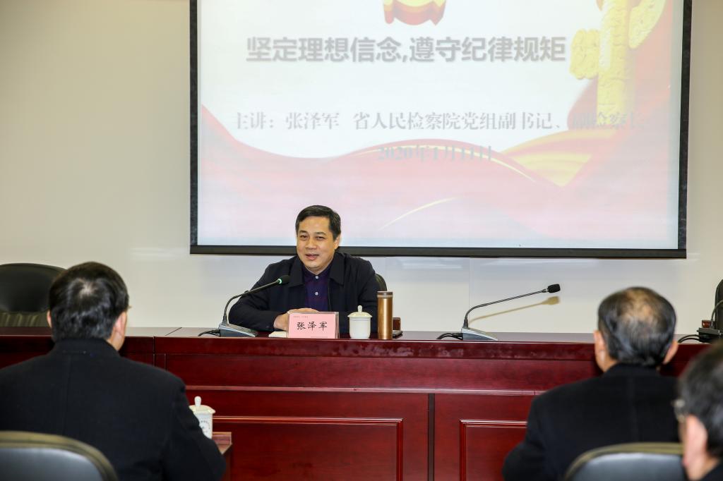1月11日,我院2020年中层以上干部寒假集训班在培训中心二楼会议室正式开班,并邀请湖南省人民检察院党组副书记、副检察长张泽军作《坚定理想信念,遵守纪律规矩》党风廉政建设专题报告,我院中层以上干部(含后备)近80余人参加。党委书记陈勇主持。