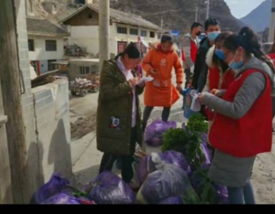 王翠同学为居民分发蔬菜等物资。