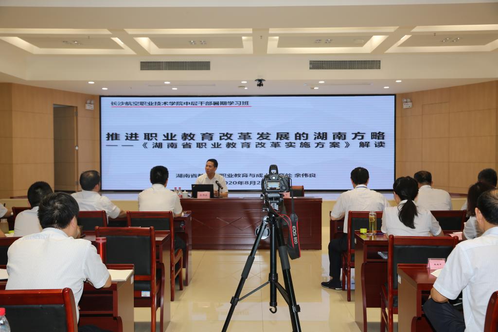 8月22日下午,省教育厅职业教育与成人教育处处长余伟良来院作“推进职业教育改革发展的湖南方略”专题报告,详细解读《湖南省职业教育改革实施方案》,分享对职业教育发展的思考与探索。我院中层以上干部(含后备)60余人聆听了讲座。党委书记陈勇主持。