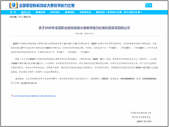 12月12日,2020年全国职业院校技能大赛教学能力比赛决赛现场传来捷报,我院文韬团队、田娟团队的作品,分获一等奖和三等奖,实现了我院在该项赛事中的新的突破,为学院大力推进双高校建设又立新功。