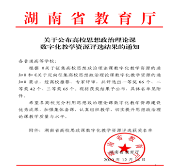 本次评选由湖南省教育厅主办,共130多个高校参加。经高校推荐、专家评审我校共7个专题获得奖项,此次大赛,既是对我院老师教育水平的检验,也是对我院教育工作的检验,有利于各高校充分思想政治理论课数字化教学资源建设优秀成果,加强集体备课,认真组织教学。(思政课部 姚睛 供稿 许燕 审稿)