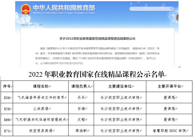 2022年12月15日,教育部职业教育与成人教育司《关于2022年职业教育国家在线精品课程遴选结果的公示》,我院文韬主持的《飞机铆装与机体结构修理技术》、田娟主持的《公共英语》、乐乐主持的《飞机维修手册与文件的使用》、蒋焕新主持的《航空服务英语》等4门课程成功入选2022年职业教育国家在线精品课程,我院精品课程建设取得历史性重大突破。