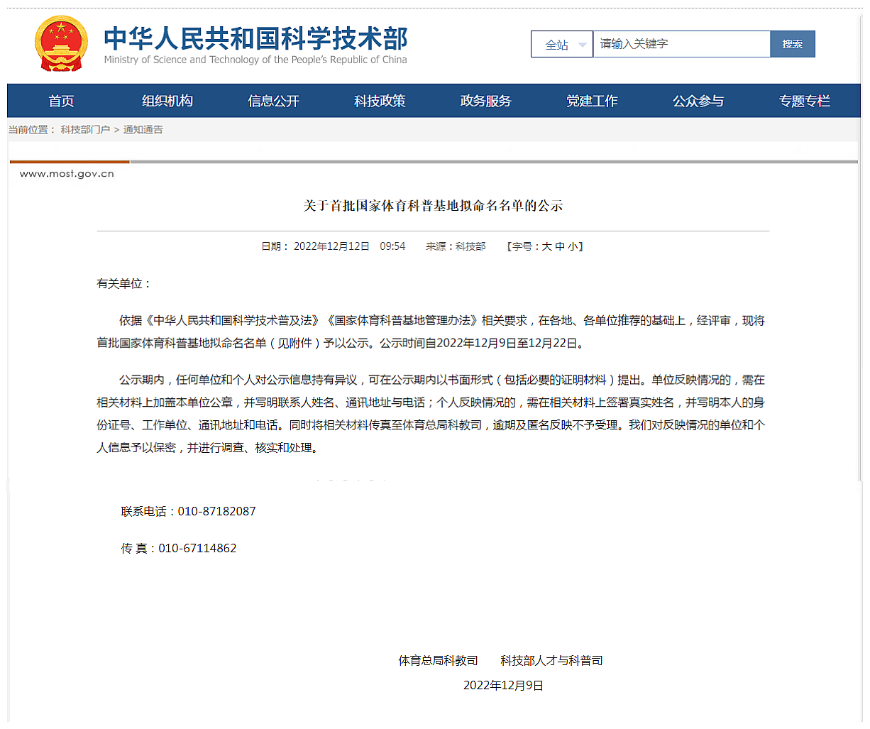 2022年2月,国家体育总局办公厅、科技部办公厅启动了首批国家体育科普基地申报与评审工作,我院航空馆根据申报要求和条件全面梳理体育科普工作开展情况,历经材料申报、视频答辩、现场评审等环节成功入选首批国家体育科普基地。