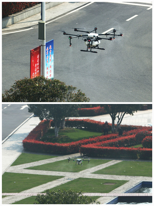 王怀超作为飞手,负责操作无人机,全程手动控制航线飞行;吴晶负责后勤保障,更换电池和充电。曾获全国职业院校无人机应用创新技能大赛最佳飞手的王怀超,克服校园作物高低不平,高楼、路灯障碍物多等困难,1小时基本完成学院跳马校区的乔灌木农药喷洒。而以往此项工作需要5个绿化技师2天才能完成。